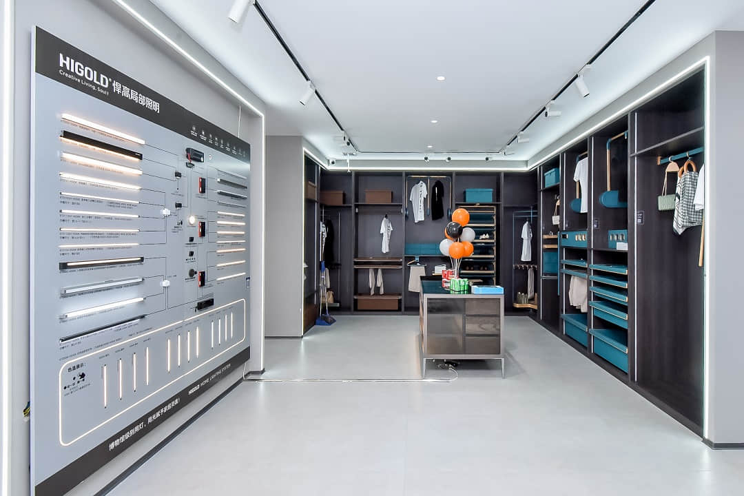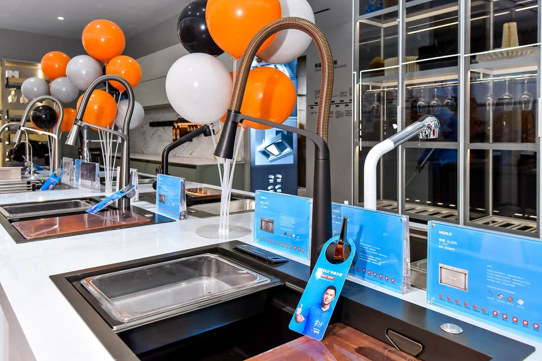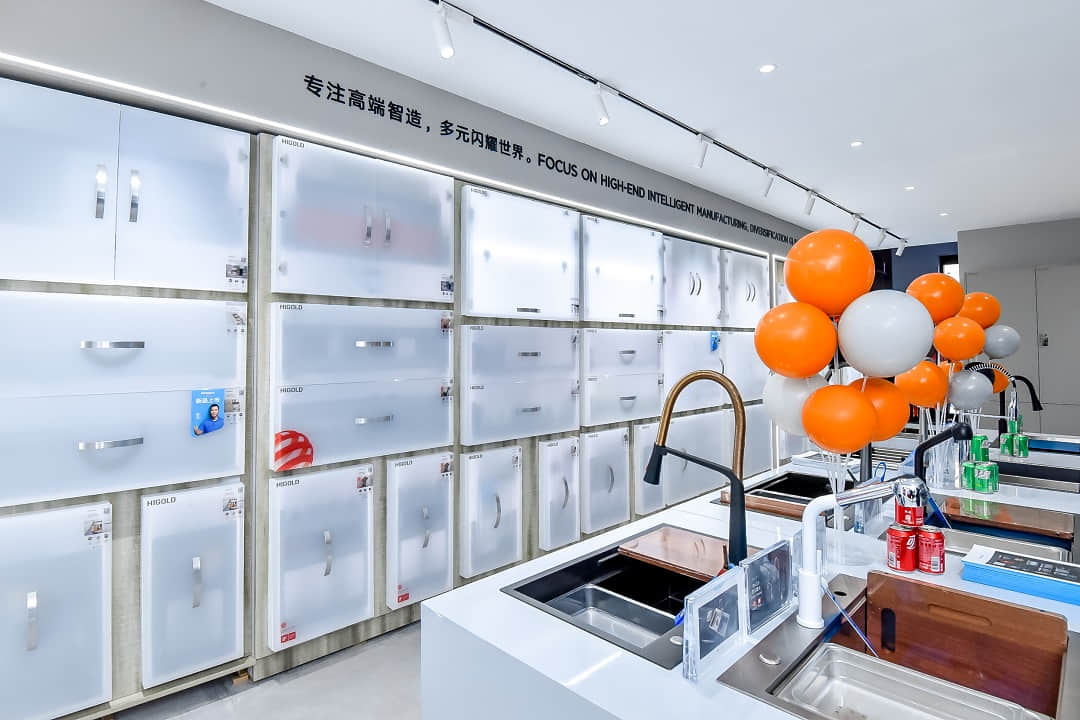 悍高哈爾濱旗艦店展廳空間規(guī)劃為廚房功能五金、衣柜功能五金、基礎(chǔ)五金、水槽龍頭、裝飾五金、智能廚電、衛(wèi)浴五金區(qū)域,消費者到店即可體驗一站式的全屋五金解決方案。