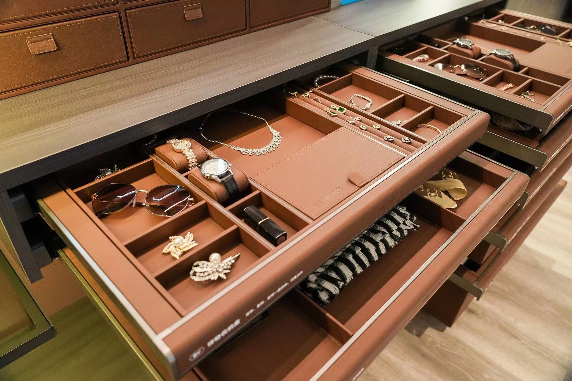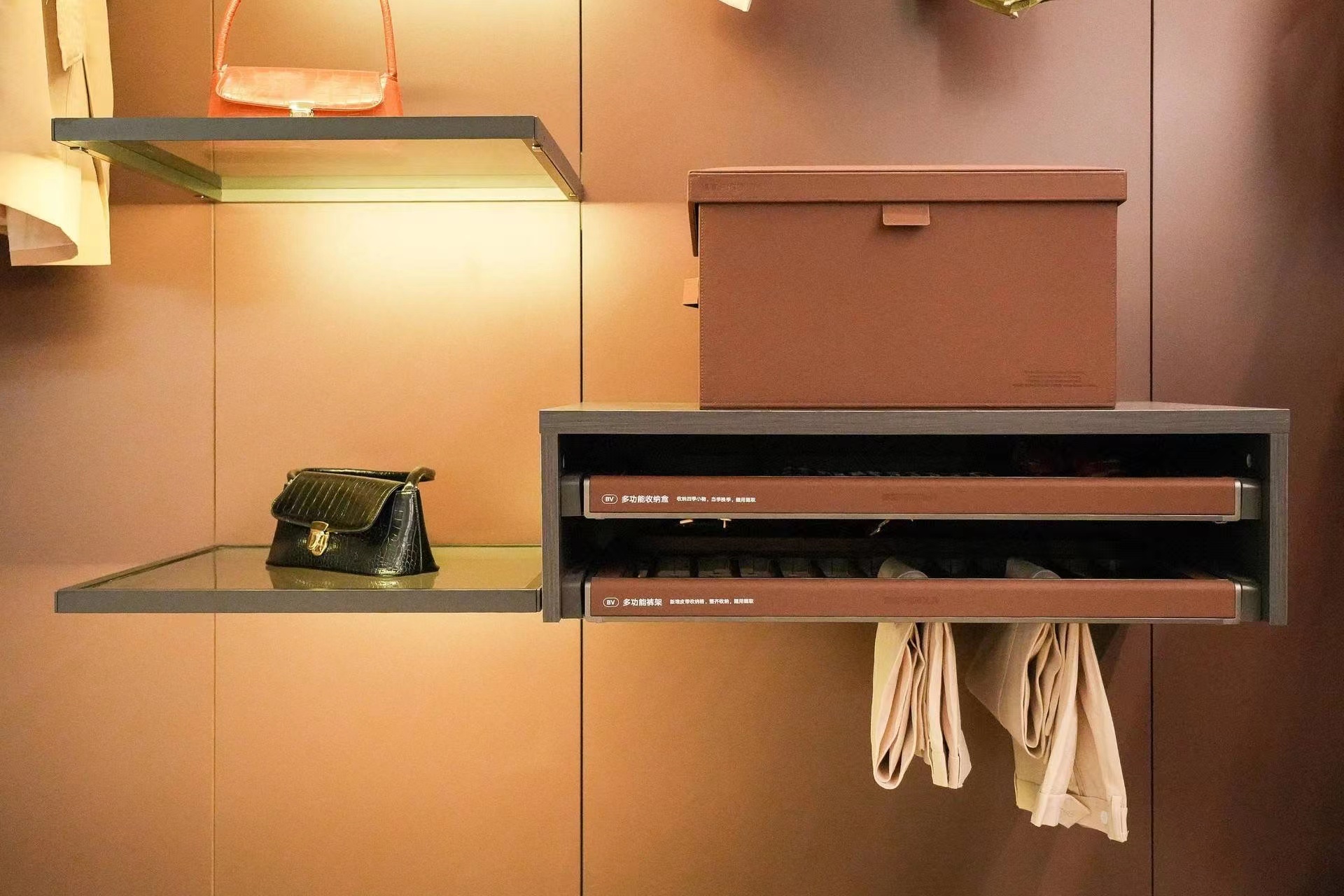 輕奢復(fù)古的BV系列衣柜五金產(chǎn)品,兼具視覺美感與實用功能性,清冷的金屬與細膩的皮革相映,極致的材質(zhì)與觀感碰撞,營造優(yōu)雅又舒適自由的衣柜收納體驗。柜體內(nèi)隱嵌的纖薄槽燈增添柔和輝光,將雕琢至臻的細微之處一并傳遞,以質(zhì)感和細膩吟唱生活詩意。