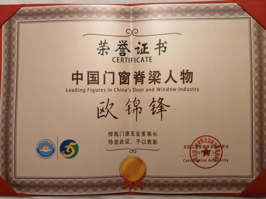 悍高集團(tuán)董事長歐錦峰先生憑借其對門窗五金極致的品質(zhì)追求與卓越的原創(chuàng)設(shè)計(jì)精神,榮膺門窗行業(yè)至高榮譽(yù)——中國門窗脊梁人物。