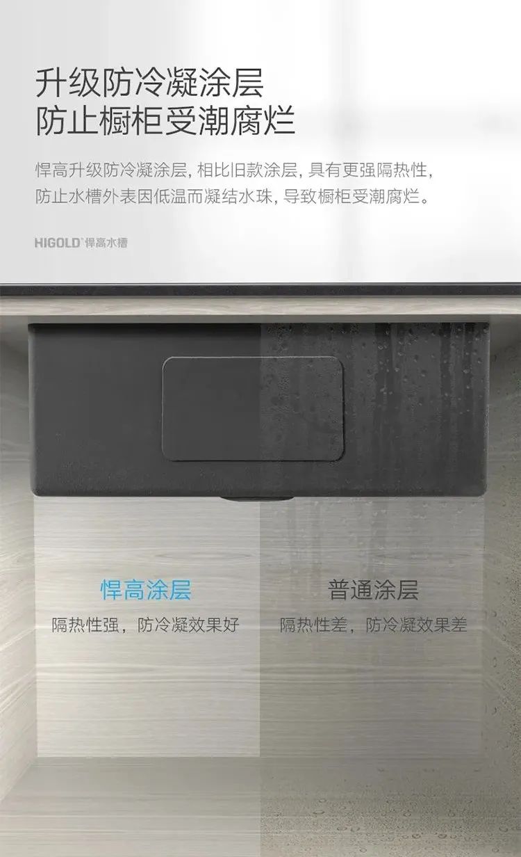 底部的防冷凝涂層,可以防止水汽凝結(jié)滴落,從而避免水槽和櫥柜受潮腐爛,讓廚房更潔凈。